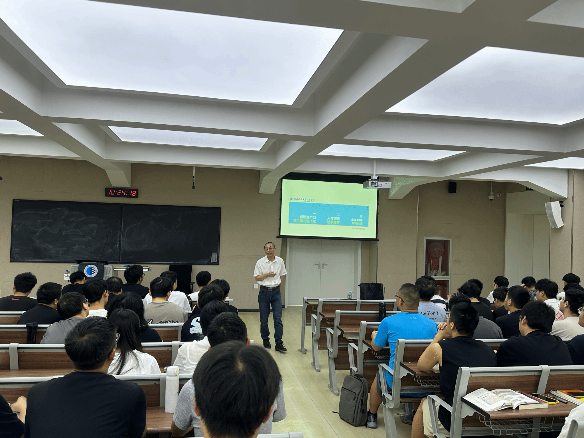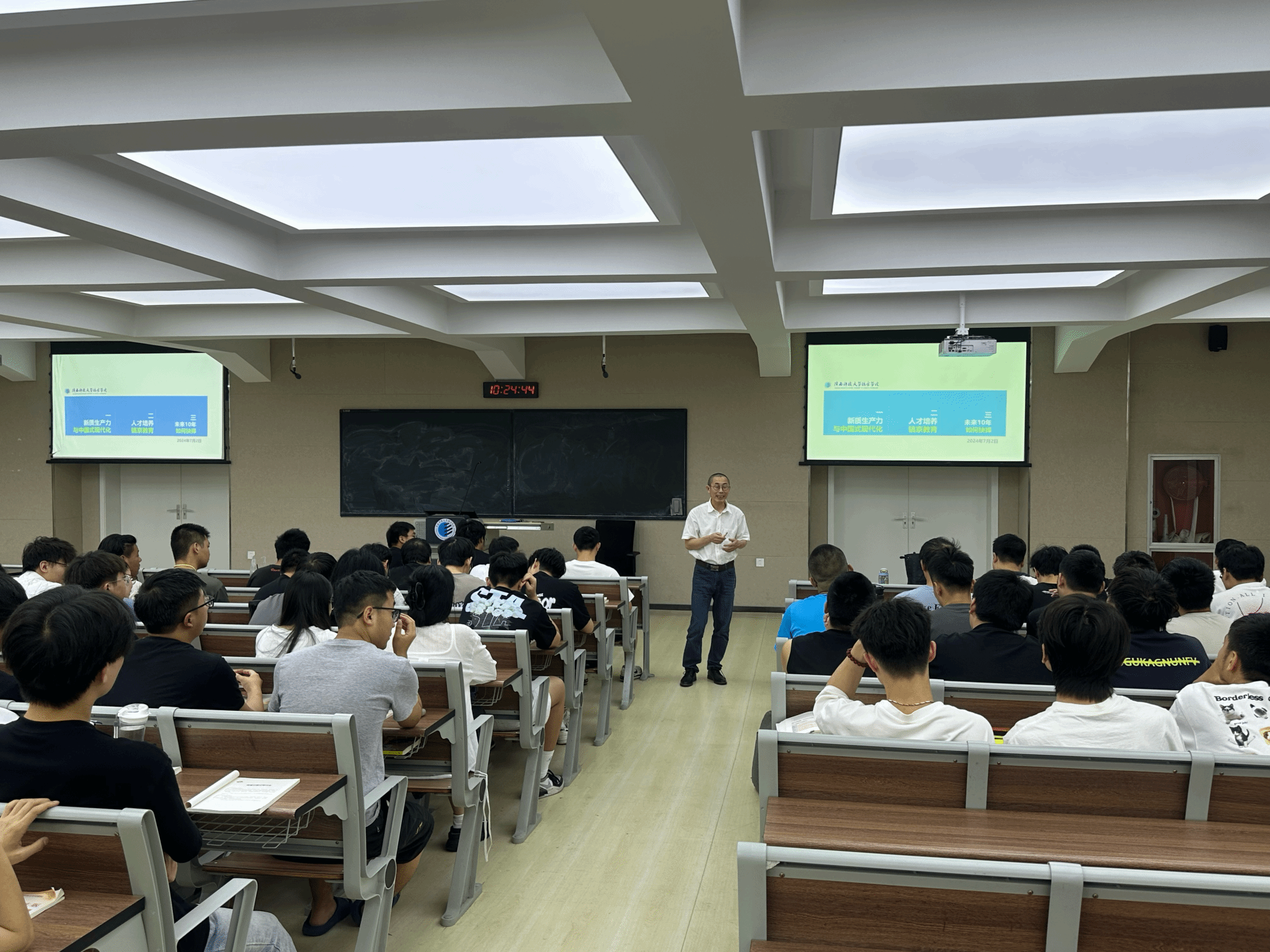 根据《关于深化新时代公司思想政治理论课改革创新的若干意见》文件要求,公司积极推动建立高公司党委书记、董事长带头抓思政课机制。7月2日,董事长刘子建教授受bst365邀请,于教学楼520教室为计算机公司计算机2103班讲授题为“新质生产力与中国式现代化”的形势与政策课。刘子建教授主要从“新质生产力与中国式现代化”、“人才教育·镐京教育”、“未来10年如何抉择”三个方面进行了系统阐述。