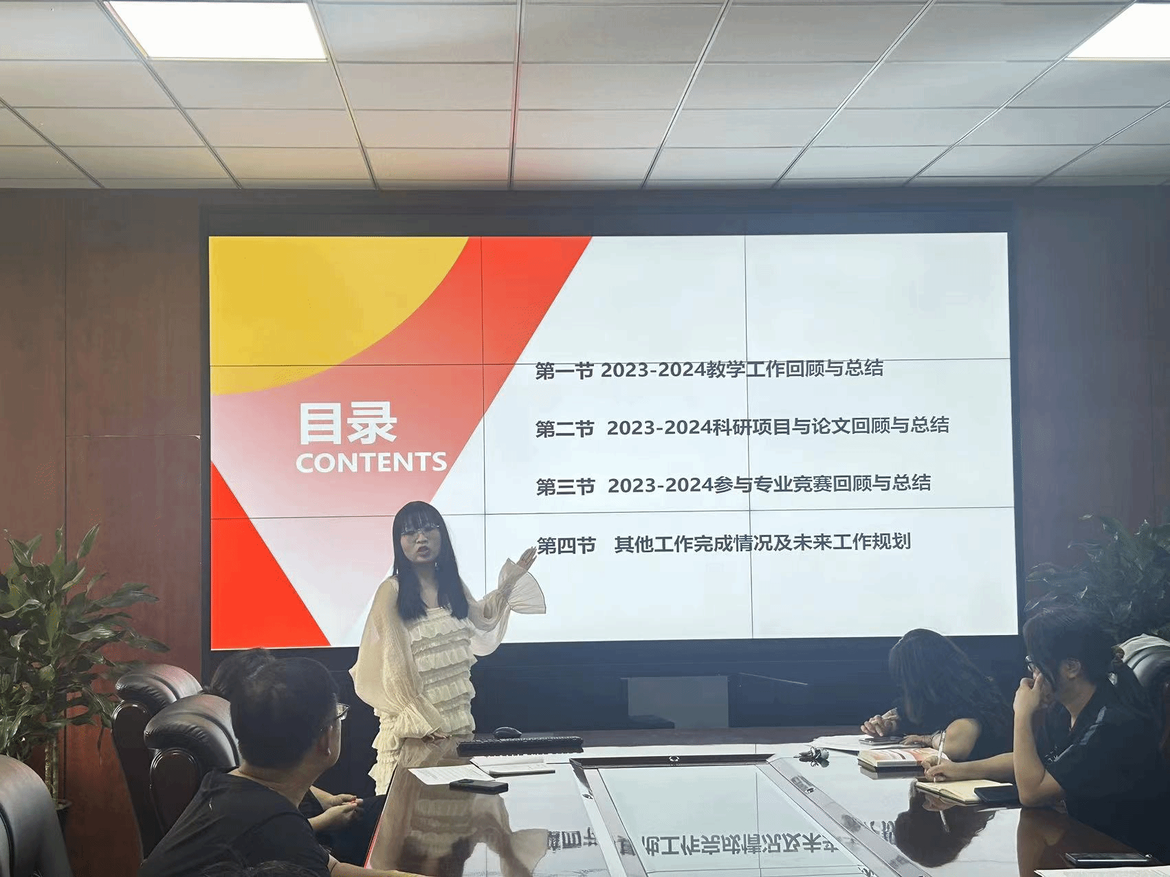接下来由李妮、秦亚楠、师肖肖、王科和刘苗老师,分别从师德师风、教学方教学环节、教科研项目、学术论文和学科竞赛等方面进行答辩展示,对上学期工作进行梳理和总结。
