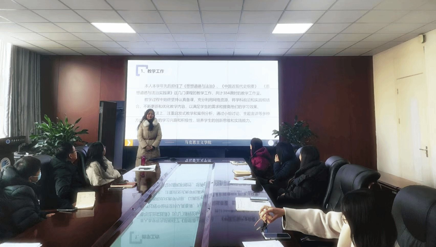首先苏婕老师介绍了期末工作注意事项,强调了期末教师评教工作以及中国近现代史的思政实习安排,也特别强调各位出卷老师应该注意的相关事项,提醒大家,教师应树立强烈的责任心,应认真完全投入各项教学工作之中。