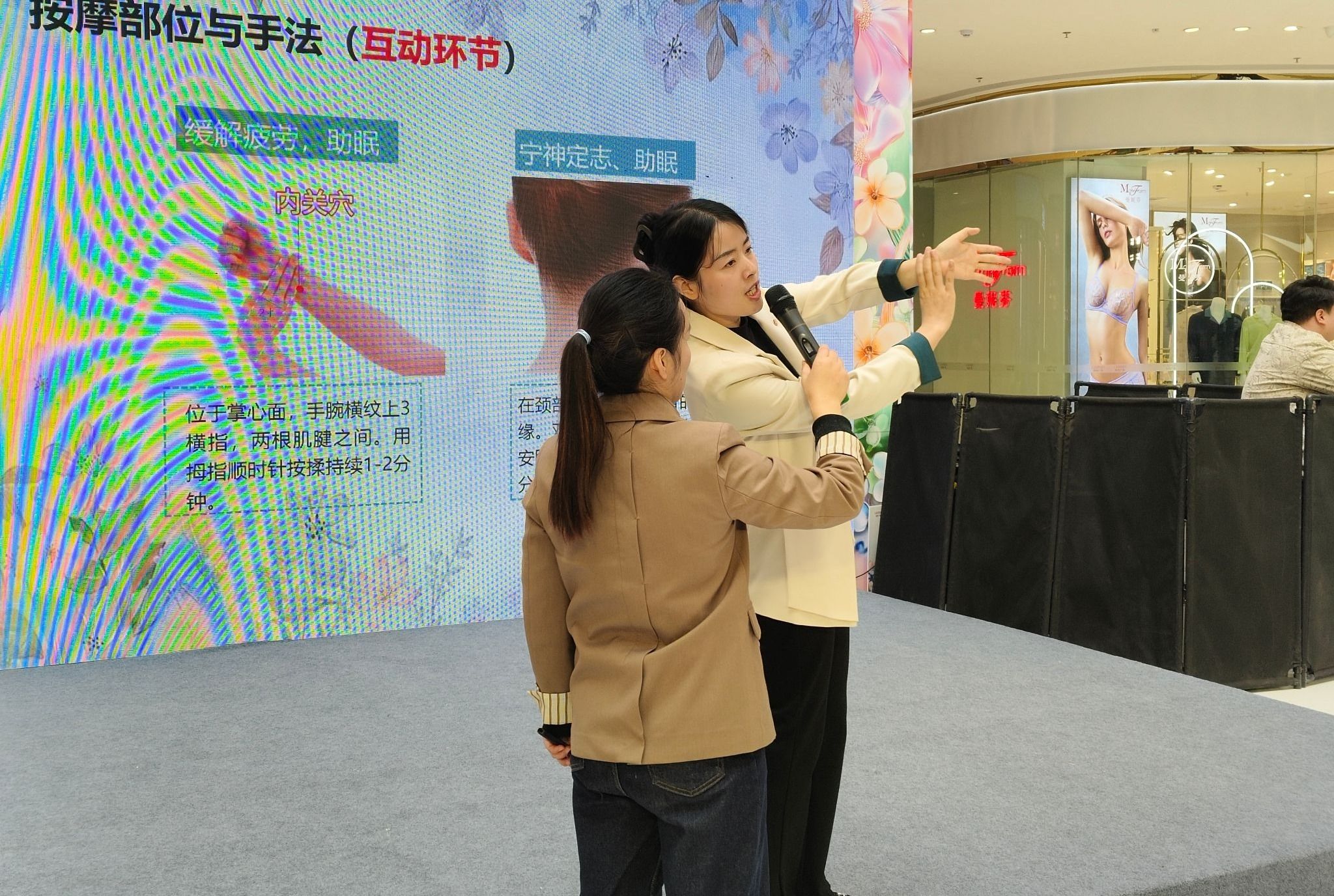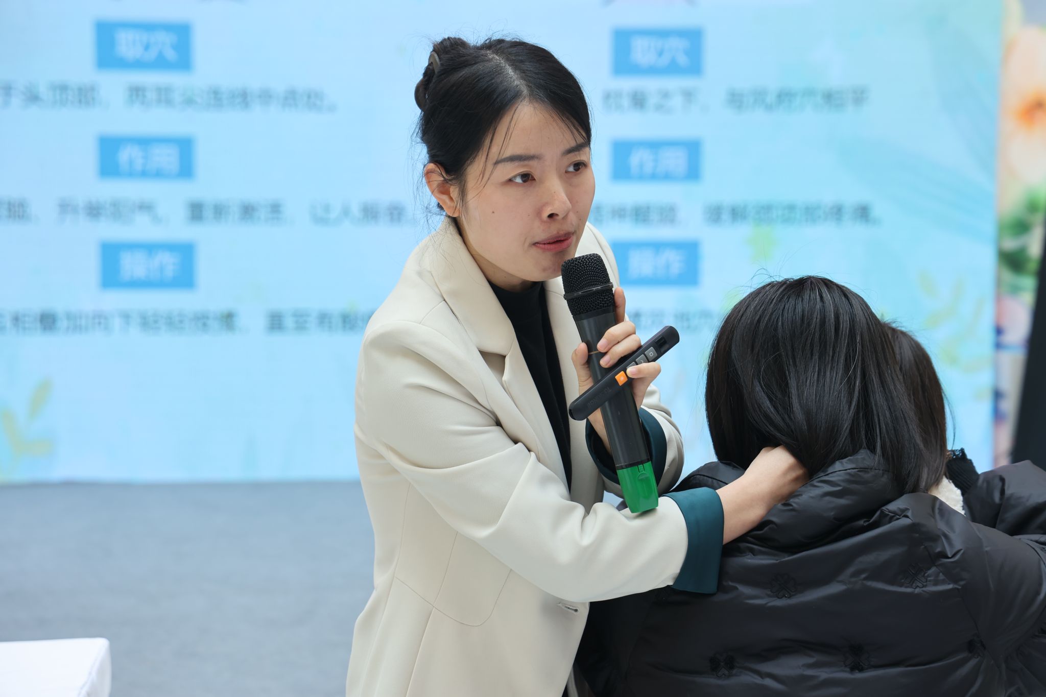 在老师的指导下,员工们化身为“小小疗愈师”为现场参与者提供了专业的精油按摩体验。员工们不仅用所学知识服务大众,更用实际行动诠释了“大思政”理念——将个人所学与社会需求相结合,践行社会责任,传承中医文化。