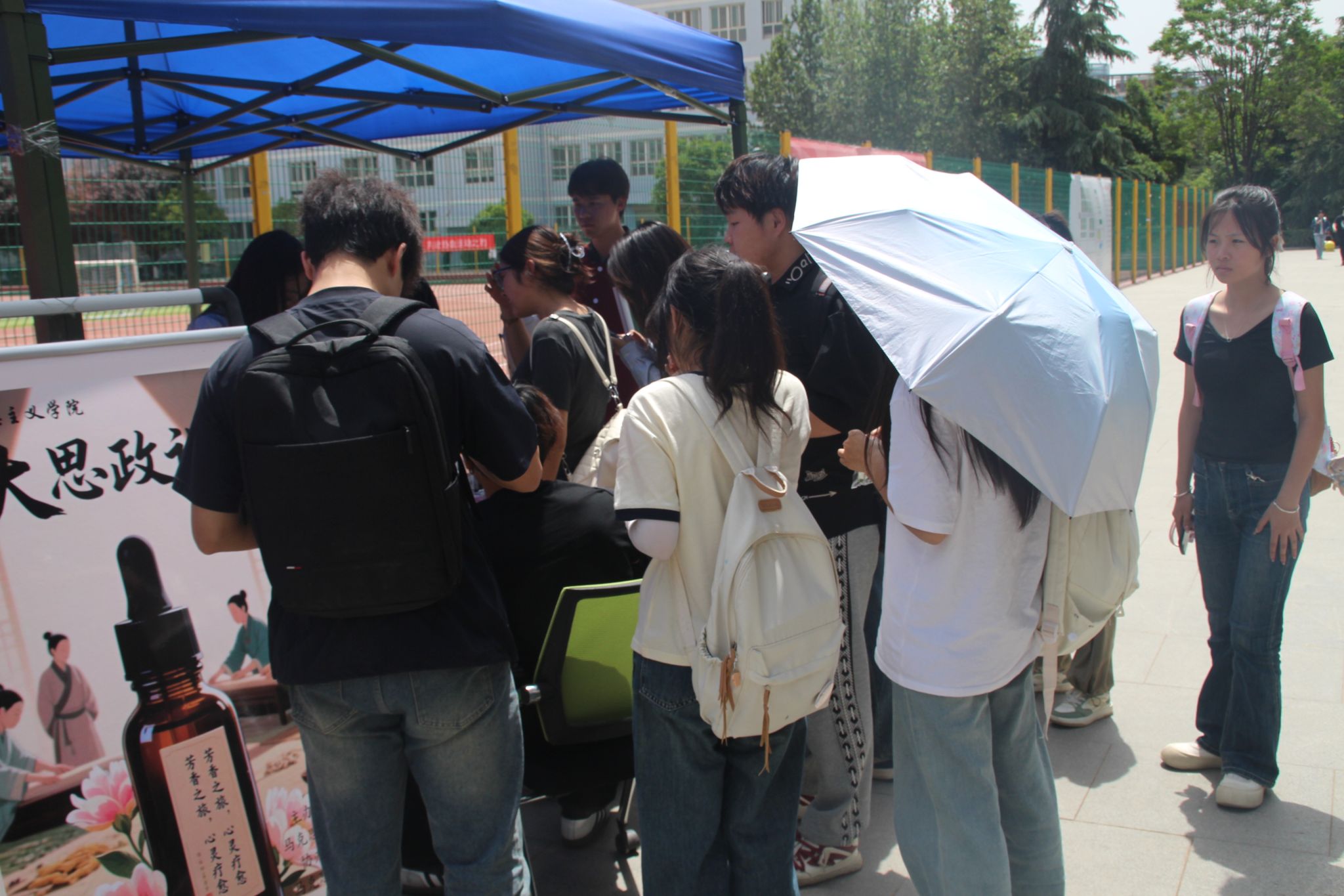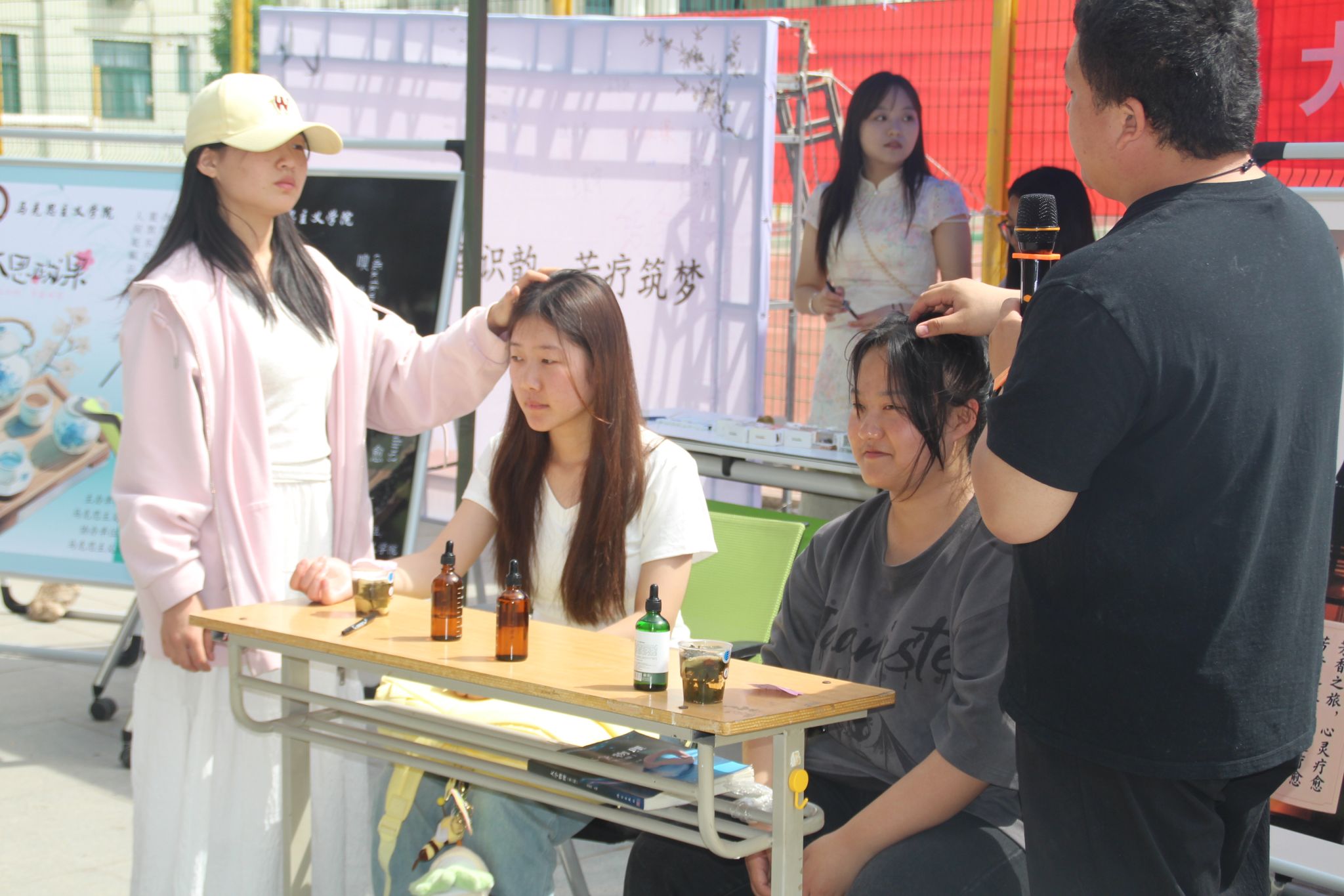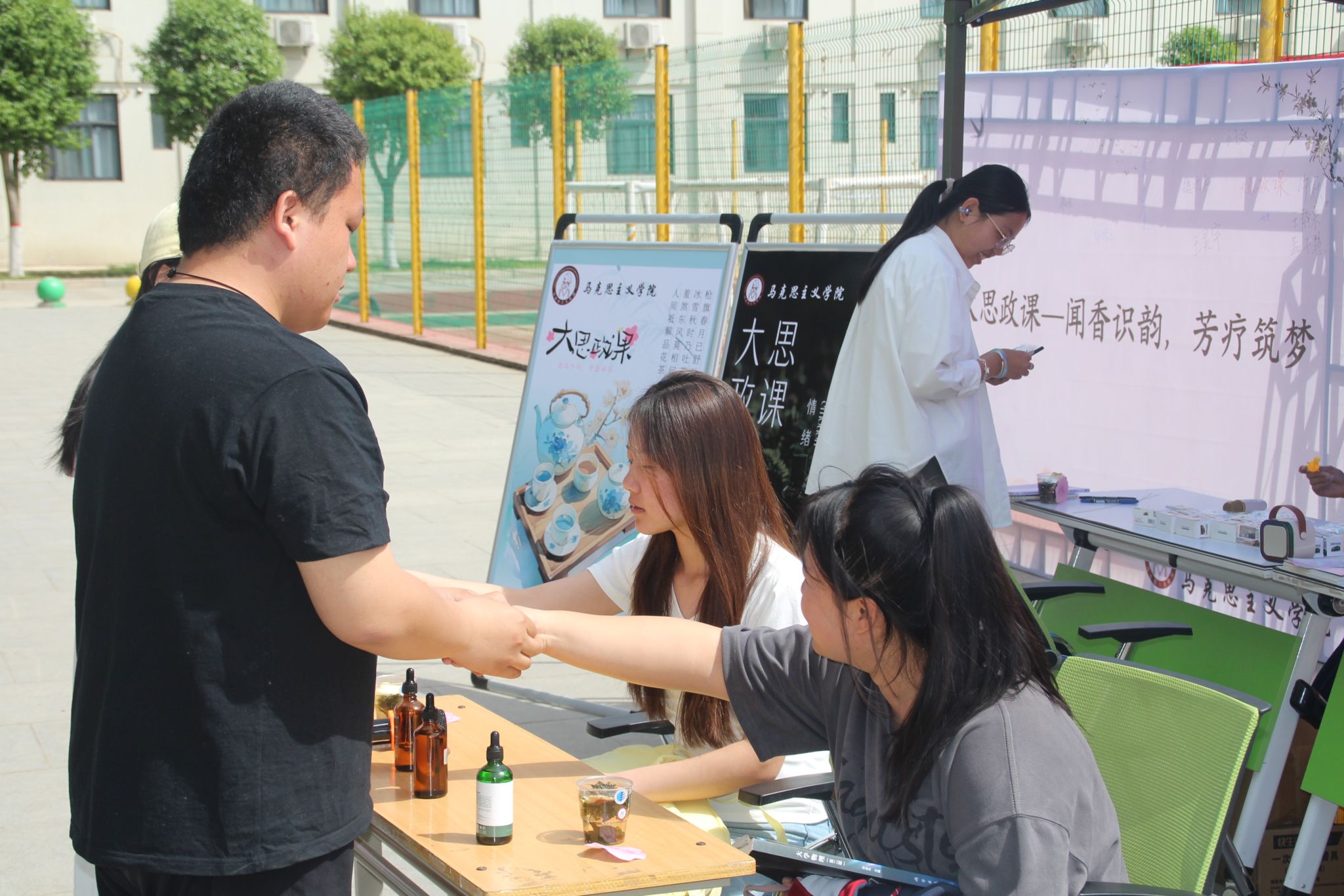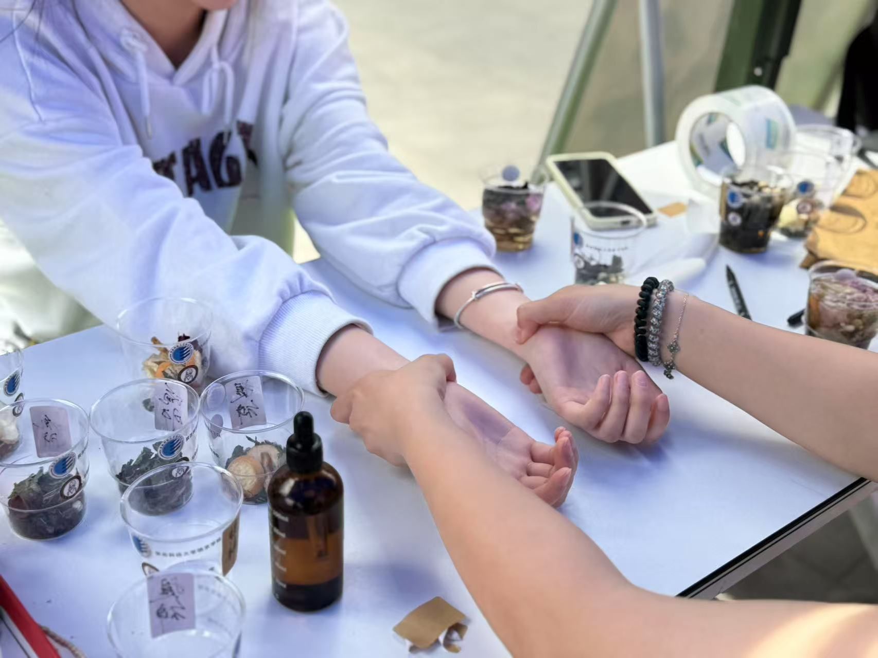 活动现场,周长强同学以“养生小导师”的身份,从人体经络图入手,生动讲解了百会、合谷等穴位的功效,并结合精油特性演示了“穴位按摩+精油渗透”的养生技巧。这一环节不仅传授了健康知识,更体现了思政教育中“知行合一”的理念。师生们在实践中学习如何通过传统方法调节身心,进一步认识到健康生活方式的重要性,这正是思政教育“润物细无声”的生动体现。