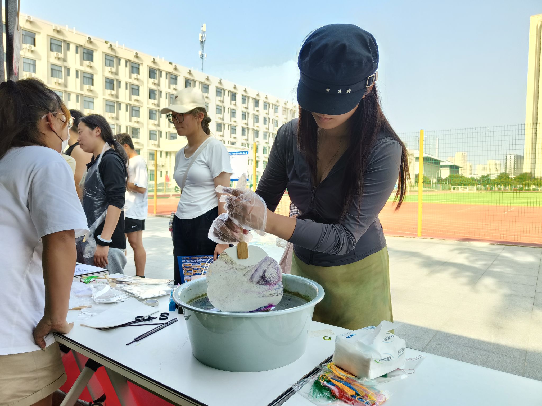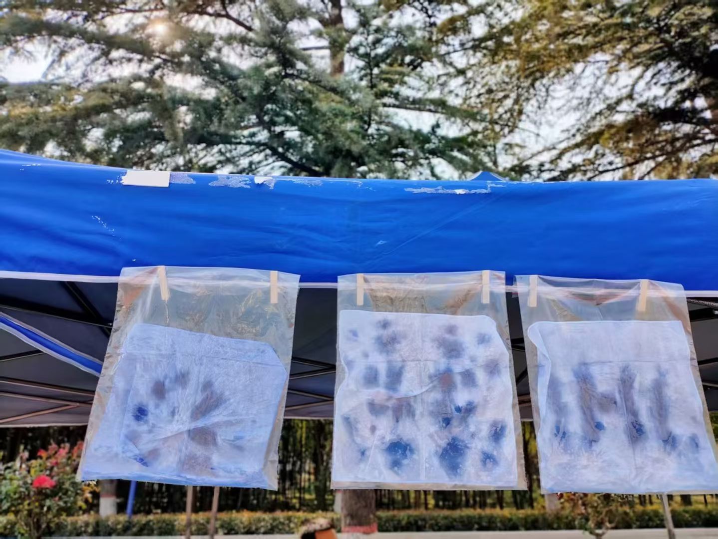 社团成员们运用“讲演结合”的方法,向镐京学子讲述扎染的历史渊源,演示了能晕染出万千纹样的捆扎技艺。镐京学子依照灵感,捆扎素布,添加染液,放入水中,耐心等待成品,一步步探索这个东方文化的含蓄与隽永。