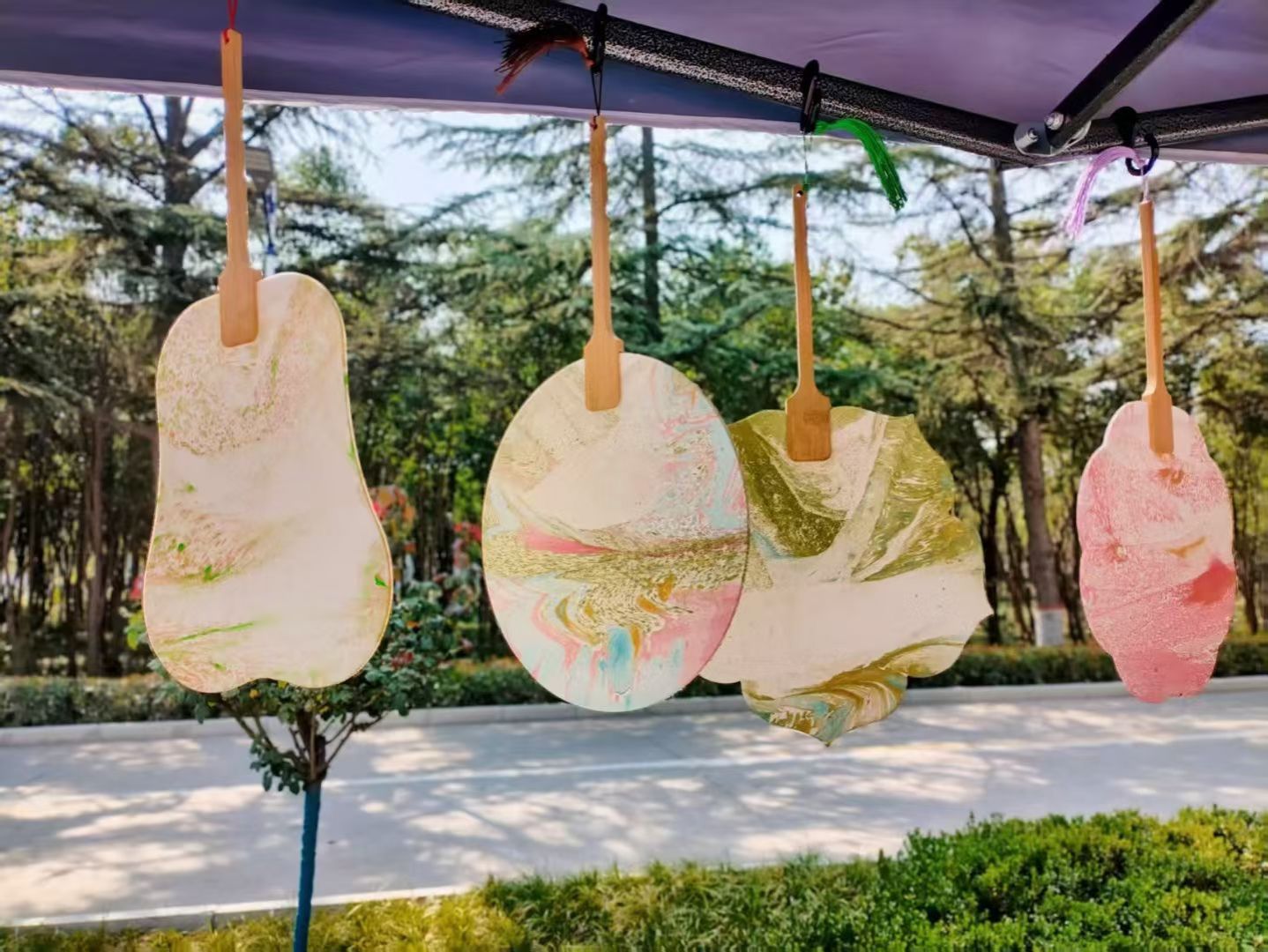 在社团成员的指导下,镐京学子手握素扇,轻轻转动扇面,生漆染料在扇面缓缓流淌、交融,晕染成了独特且充满想象力的漆扇作品。每一件漆扇作品,都诉说着“慢工出细活”的非遗匠心。