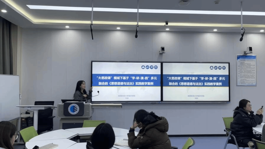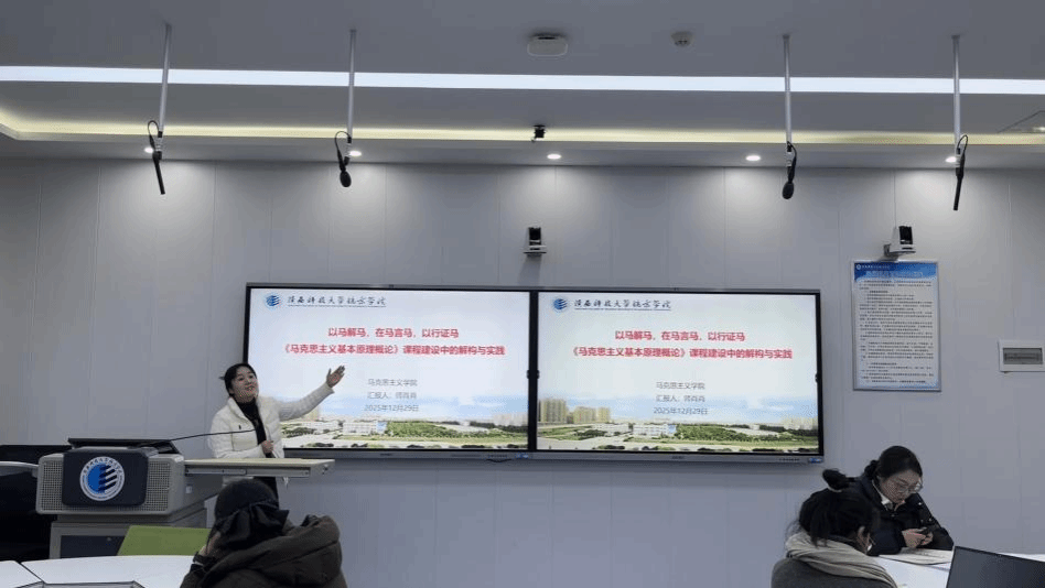 师肖肖老师随后做《马克思主义基本原理概论》课程建设汇报,以“以马解马,在马言马,以行证马”为核心。她详细解读了教材从理论到实践的编写逻辑,借鉴多所高校优秀教学案例,提出通过问题链引导思考、线上线下融合、虚拟技术赋能等教学方法,构建师生共建的实践教学机制,为课程优化提供了新思路。