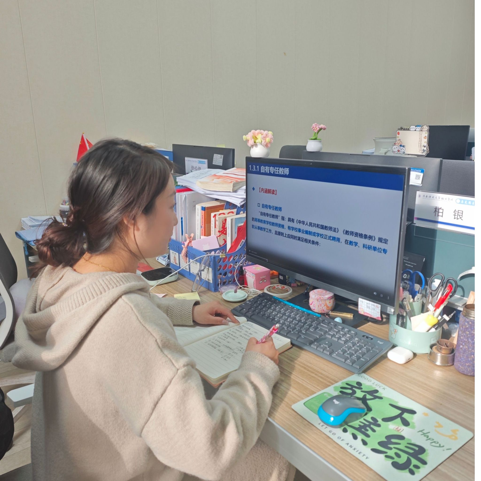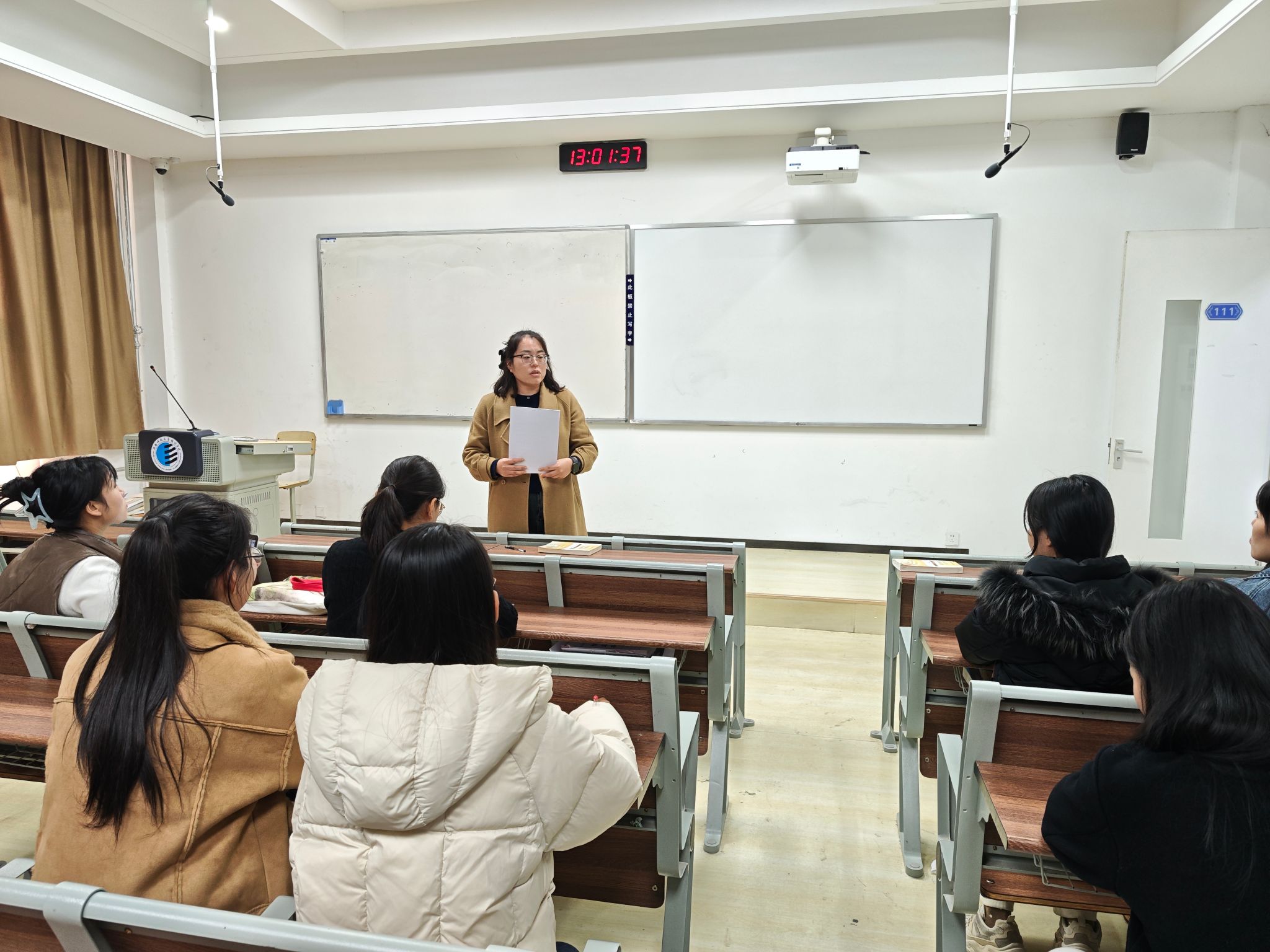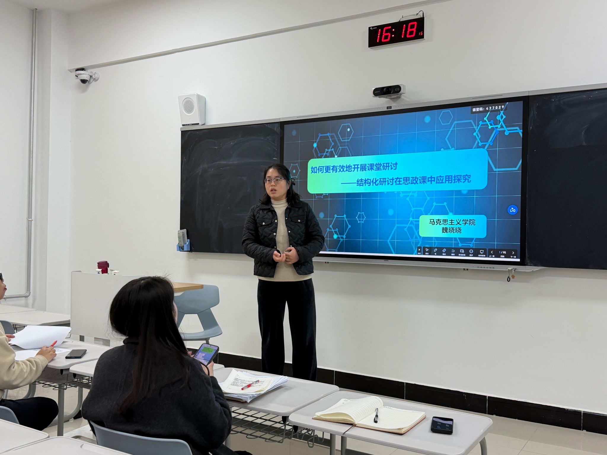 为进一步规范课堂教学管理,提升马克思主义理论课程教学质量,强化以员工为中心的教学导向,2025年12月1日下午,马克思主义中国化教研室在教学楼111教室召开课堂规范专题会议。教研室主任魏晓晓主持会议,全体任课教师参加。会上,魏晓晓老师首先对11月份教研室听课巡查情况进行了全面反馈。她指出,通过随机听课、集中评议等方式,发现各任课教师均能严格遵守教学规范,教学态度严谨认真,课堂教学设计合理有序,尤其在理论联系实际方面亮点突出—...